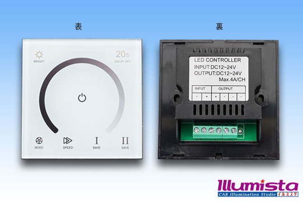 | 単色タッチコントローラー 12/24V 12A タッチパネル操作の単色テープLEDコントローラーです。 本体前面はおしゃれなガラスパネル仕様のタッチパネルで、 別売の固定BOXで壁面に埋め込んで取り付けることができます。 タッチボリュームで明るさを細やかに調整できるほか、 3段階の光量選択ボタンとお好みの設定を2つまで保存でき、すぐ呼び出せます。 また、本体に内蔵されたデモパターンでにぎやかに発光させることもできます。 20秒後に自動で消灯するOFFタイマーボタンも用意されています。 設備照明用の操作パネルなどにご活用ください。 単色タッチコントローラー 12/24V 12A 2,980円/台 ■機能 単色プログラムモード×4パターン+オートデモ スピード調節 6段階 設定記憶ボタン×2 タッチボリューム調光機能 ON/OFF機能 前回動作記憶機能 ■製品仕様 入力電圧 : DC12-24V ※ご使用のテープにあわせた電源をご使用ください。 出力チャンネル: 3チャンネル (同色3系統) 出力電流 : 4A×3チャンネル (max12A) 定格電力 : DC12V 144W、 DC24V 288W 待機電力 : 1W未満 接続方式 : アノードコモン (+が共通) 動作温度 : -20℃〜+60℃ 本体サイズ : W86×D86×H36mm(本体最大寸法) 重量(約) : 118g(本体) 付属品 : 固定用ボルト2本 ※ご使用の際にはテープLEDおよびDC電源が別途必要になります。 ※テープLEDの電圧に合わせた電源をお使い下さい。 中国製 ■ご注意 ※電源のプラス/マイナスを逆に繋いだりショートさせないでください。 ※テープLEDを接続する際には必ず電源を切ってから接続して下さい。 ※本製品は防水ではございません。水のかかる場所等では使用しないでください。 ※単色テープLED(複数使用時はアノードコモン)専用です。 その他のコントローラに対して使用することはできません。 ※テープLEDおよびDC電源は別売りとなります。ご使用のテープLEDにあわせて別途ご用意ください。 ※ヒビ割れや破損の原因となりますので、強い衝撃や重い負荷を与えないでください。 特に、本体平面に手や肘で体重をかけたり足で踏みつけないようご注意ください。 ※当社製品以外のテープLEDや電源等を接続された場合、保証対象外となります。 ※ロットにより仕様が異なる場合があります。 ※商品はすべて出荷前に点灯確認をしておりますが、 取り付けの前に必ず点灯確認をお願いいたします。 ※保証は、商品到着後7日以内の初期不良の物に対して行います。 万が一不具合のある場合には、商品到着後7日以内にご連絡下さい。 ※本製品の分解・改造・修理や取り付け後は保証の対象外となります。 ※いかなる場合にも、本体代金以上の保証はいたしません。 上記ご了承の上お買い求め下さい。 |