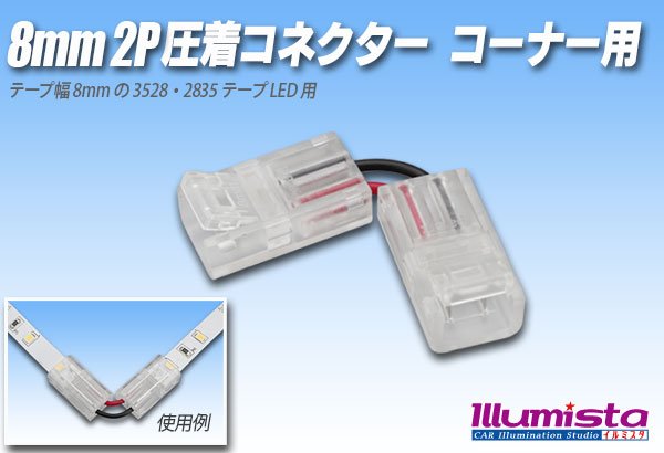 8mm2P 圧着コネクター コーナー用 テープ幅8mm2芯タイプの3528・2835テープLEDに使用が可能な配線付きL字コネクターです。 テープを差し込んで挟むだけのワンタッチ式コネクターです L字タイプとなりますのでコーナーでの連結処理にご利用ください。 8mm2P 圧着コネクター コーナー用 バラ1個 200円 10個セット 1,500円 100個セット 13,000円 全体寸法(約):34×34×7mm コネクタ寸法(約):11×21×7mm ■対応テープLED:テープ幅8mmの2芯式で非防水またはクリアドーム製品 ※ご注意※ ピッチの狭いテープLED(600LED/5mなど)に使用する場合、 コネクタの電極がテープLEDの電極部に当たる様調節してください。 奥まで押し込んで使用するとLEDが破損してしまいます。 ※テープ幅8mmの2芯式用の連結コネクターです。 他の規格のテープには使用できませんのでご注意ください。 ※手で圧着しにくい場合、ペンチなどで確実に圧着して下さい。 ※テープ電極にハンダが盛ってあるテープの場合差し込みづらい事があります。 この場合、ハンダ吸い取り線などでハンダを除去してからご使用下さい。 ※当商品は、防水ではありませんのでご注意ください。 ※挟むだけのコネクターですので強く引くと抜けてしまう恐れがあります。 ※取り付け後の交換・返品には一切対応できません |