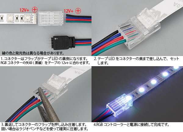 10mm4P RGB圧着コネクター 電源用 テープ幅10mm4芯タイプの5050RGBテープLEDなどに使用が可能な 圧着式の電源用コネクターです 4pinコードを接続して電源投入や、 平行線を接続して延長コードの作成が可能です 10mm4P RGB圧着コネクター 電源用 バラ1個 100円 10個セット 750円 100個セット 6,000円 コネクタ寸法(約):13×21×7mm 適応配線:AWG24-22 ■対応テープLED:テープ幅10mmの4芯式で非防水またはクリアドーム製品 ※ご注意※ ピッチの狭いテープLED(600LED/5mなど)に使用する場合、 コネクタの電極がテープLEDの電極部に当たる様調節してください。 奥まで押し込んで使用するとLEDが破損してしまいます。 ※テープ幅10mmの4芯式用の連結コネクターです。 他の規格のテープには使用できませんのでご注意ください。 ※手で圧着しにくい場合、ペンチなどで確実に圧着して下さい。 ※テープ電極にハンダが盛ってあるテープの場合差し込みづらい事があります。 この場合、ハンダ吸い取り線などでハンダを除去してからご使用下さい。 ※当商品は、防水ではありません ※挟むだけのコネクターですので強く引くと抜けてしまう恐れがございます。 ※取り付け後の交換・返品には一切対応できません |