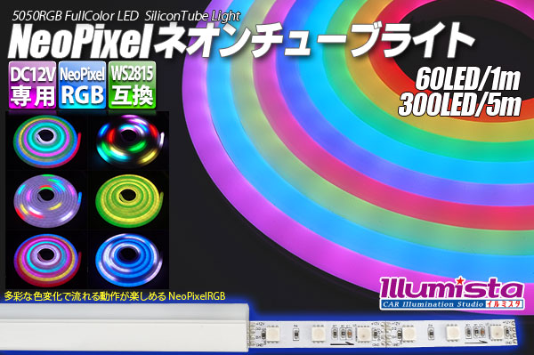 NeoPixelフルカラーLEDを使用したチューブタイプのテープLEDです。 側面発光仕様の拡散シリコンチューブでしっかりとカバーしてあるため、 従来のテープLEDでは難しかった横方向へのカーブも自在に表現でき ネオンサインのようにチューブ全体が均一に発光します。 DC12V仕様ですので長いテープも均一に明るく光り消費電力も低くなっています。 専用コントローラーを使用する事によりLED3個(1ユニット)単位での発光をコントロール可能です。 ツブ感を出したくない商品照明やディスプレイなど幅広くご利用いただけます。