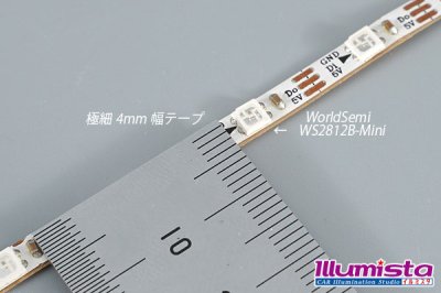 WS2812B-Miniを使用した、4mm幅の超極細テープLEDです。 ちょっとした所に動きのあるイルミネーションが作れます。 別売りのNeo Pixel RGBコントローラー 等を使用する事により LED1個単位での発光をコントロール可能です。 動きのあるオリジナルイルミネーションや、ダンス衣装用LEDの自作等に是非ご利用下さい。 超極細 3535NeoPixel MiniテープLED 1m/60LED 1,980円/本