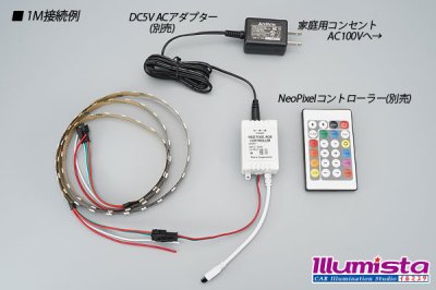 WS2812BのNeoPixel RGBを使用したテープLEDです。 便利なユニット販売となりますのでちょっとした所に動きのあるイルミネーションが作れます。 Arduinoのサンプルスケッチなども公開されています。 マイコンボードやプログラムは苦手、という方もご安心下さい、簡単な専用コントローラーもご用意致しました。 動きのあるオリジナルイルミネーションや、ダンス衣装用LEDの自作等に是非ご利用下さい。 Neo Pixel RGBコントローラー 等を使用する事により LED1個単位での発光をコントロール可能です。